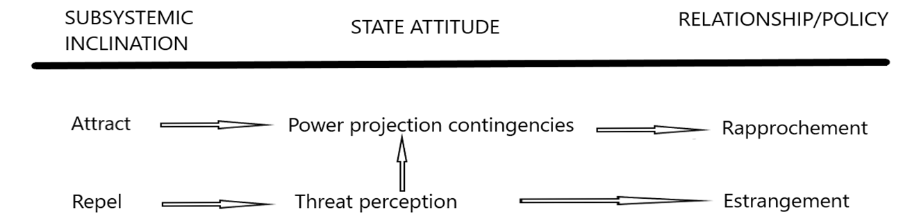 The intervening variables are as follows. “Threat perception” from a subsystem functions as a repel factor and pushes the borderland towards estrangement. “Power projection contingency,” mostly resulting from regional power vacuums, presents possibilities to redesign regional politics to gain advantages (assuming the country has such capabilities). It functions as an attract factor, causing rapprochement, even when such areas of power vacuum produce threat perception. Hence, the main elements determining the degree to which attract-repel dynamics will be converted into rapprochement or estrangement are capabilities, perceptions, and the attitude of the actor.