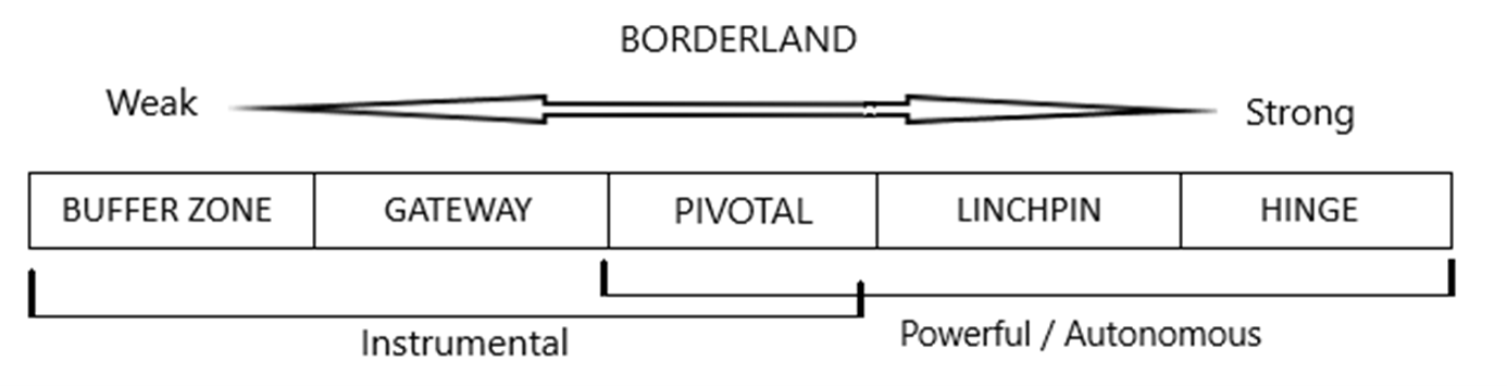 Since states react differently to inter-subsystemic dynamics, they might assume different roles as a result. Here, we take the term “borderland” as a neutral starting point and sort its versions on the basis of their power positions and roles. Geopolitical analyses use various terms to describe such positions interchangeably in a vague manner. However, in this article, each term implies a different role for the borderland state depending on its capabilities. Focusing on behavioral rather than mere geographical dimensions of a borderland, this article takes power capabilities as the yardstick for our conceptual classification. The significance of borderlands in world politics is undeniable, regardless of their power. Buzan (1991, p. 196) also points to the significance of states which “occupy insulating positions between neighboring security complexes.” The first concept related to borderlands as its weakest form is the buffer zone, which separates two regions or subsystems. Buffer zones rarely qualify as actors since they are formed or utilized by other powerful actors for their own purposes to insulate different sides from each other. However, in this paper, insulating the function of a borderland is peculiar to a very specific and exceptional case of weak buffer states. The main and more common function of borderlands is not to insulate, but rather to transmit perceptions, problems, solutions, cultures, views, attitudes, etc.